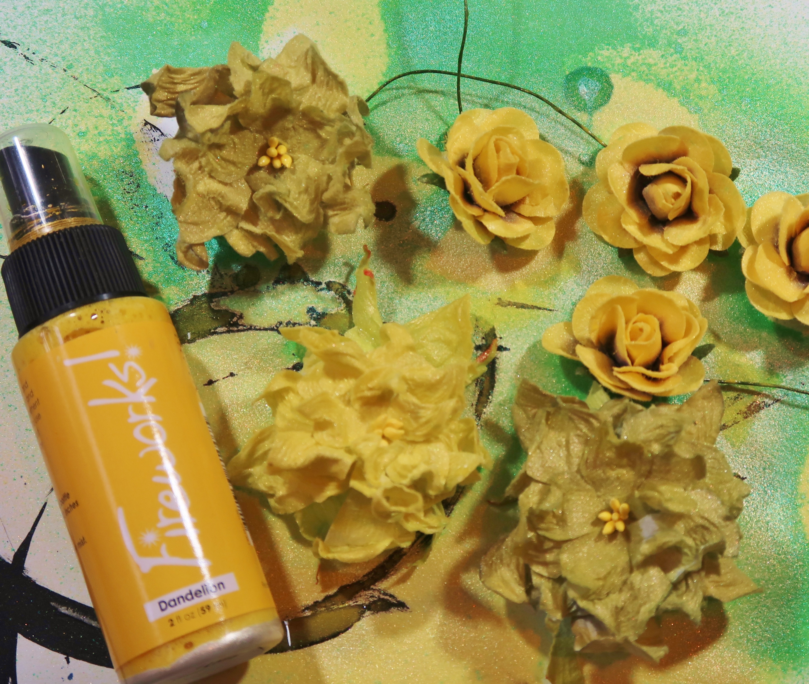 Spray foil leaves and paper flowers using Fireworks! Spray ink and allow them to dry completely.