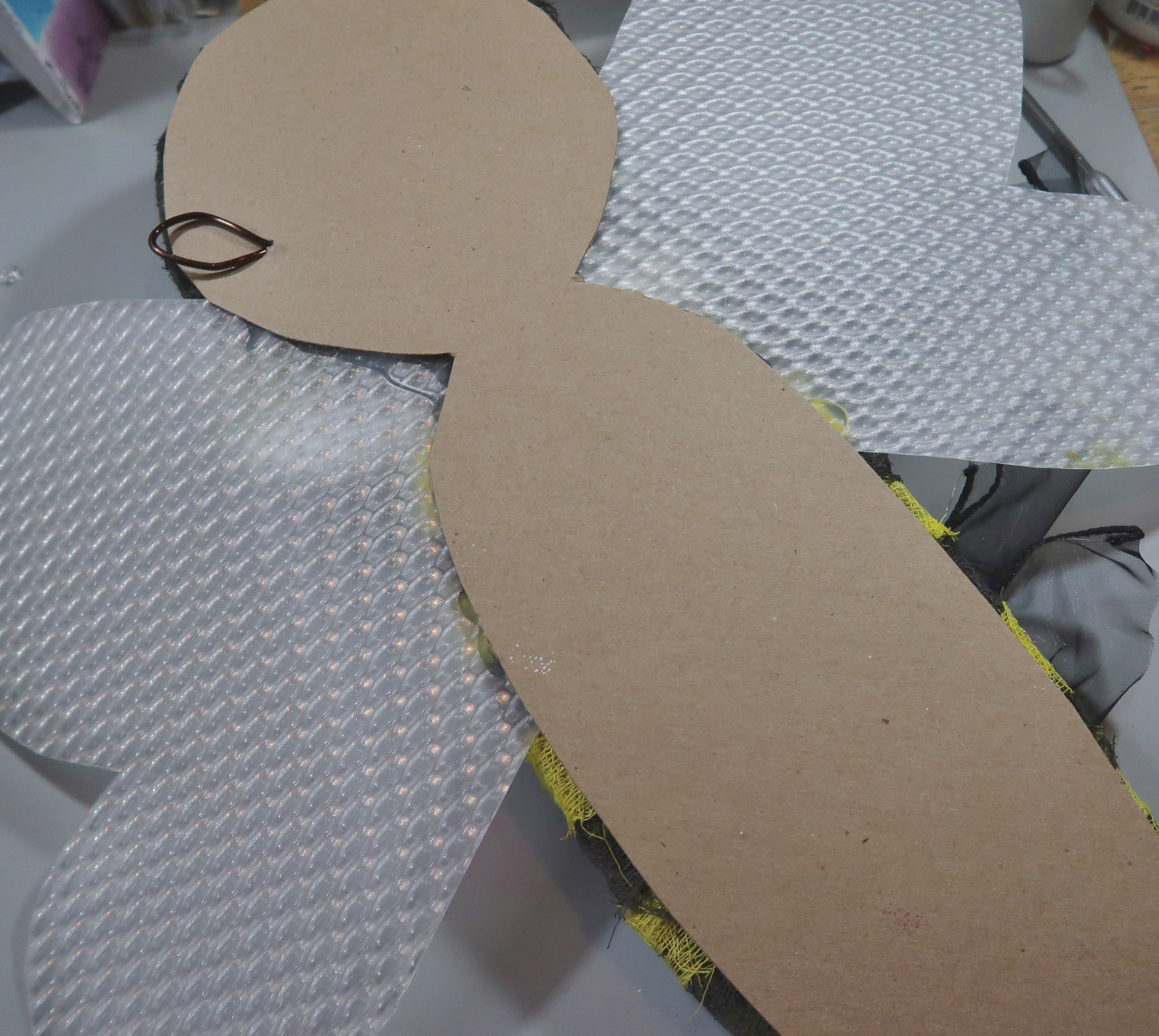 Insert a piece of wire into the second cardboard piece for a hanger. Use hot-glue to affix this cardboard piece to the back of the bee form covering the cheesecloth ends and wings.