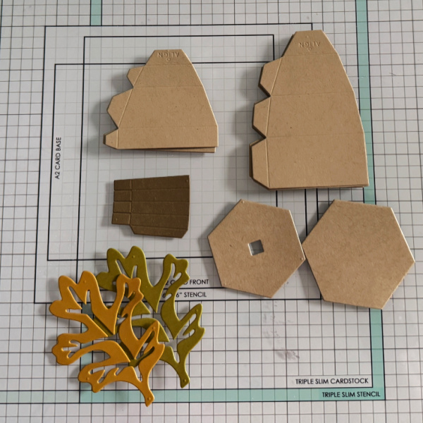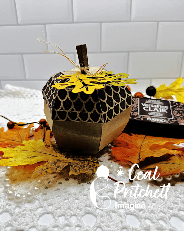 Then press the Golden Glitz Delicata ink pad onto a piece of acetate packaging and spray with water. Then press the acetate packaging onto each of the ornaments to add gold shimmer.