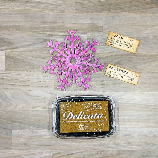 Cut out and distress the edges of 4 pre-printed winter sentiments. Then press the edges into the Golden Glitz Delicata ink pad. Heat emboss each of the sentiments with clear embossing powder.