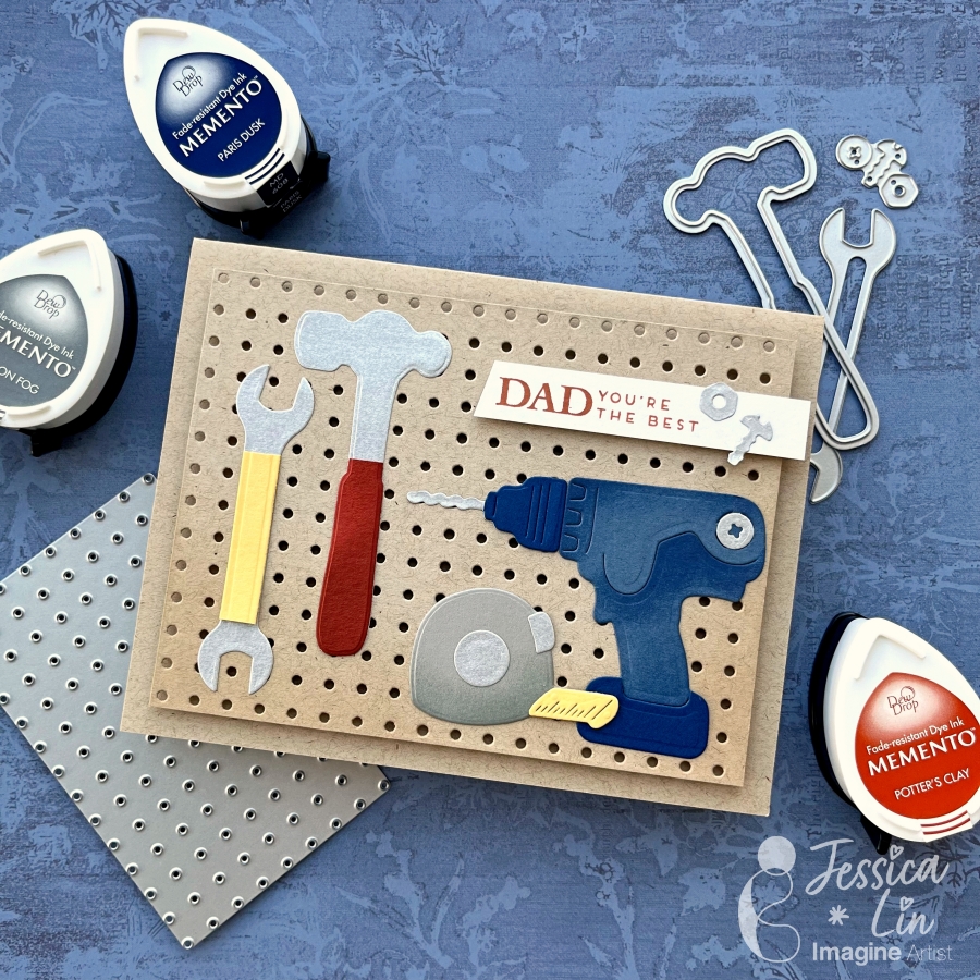 Hi everyone! It’s Jessica here. Today I would like to share a Father’s Day card that showcases different tools to thank my dad for all the home improvement projects he has done in the past year. I also ink blended Memento inks on the die cut pieces to create more depth. If you’d like to learn some tips and tricks on ink blending small paper elements, just keep reading!