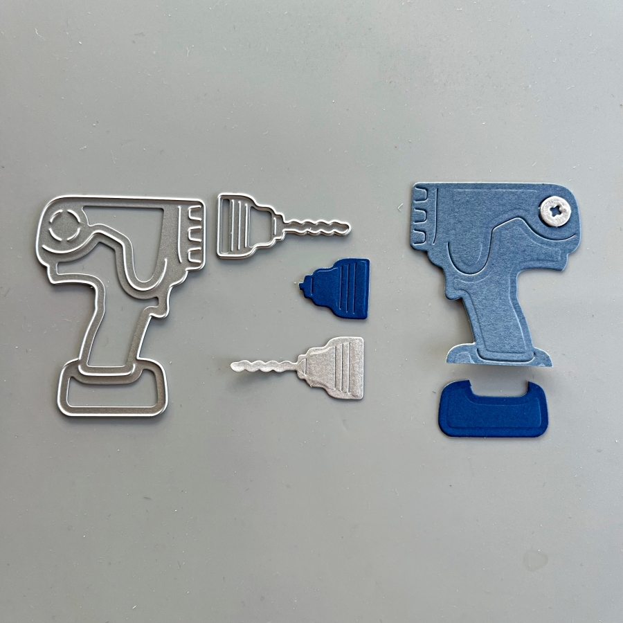 For the power drill, I used Misty Moonlight and Blueberry Bushel cardstock. I also die cut a bolt from the silver cardstock to decorate this power drill.