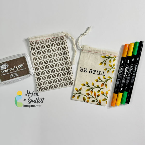 On this one, I decided to add the word Be Still on the bag using stencil and Fabrico Marker.