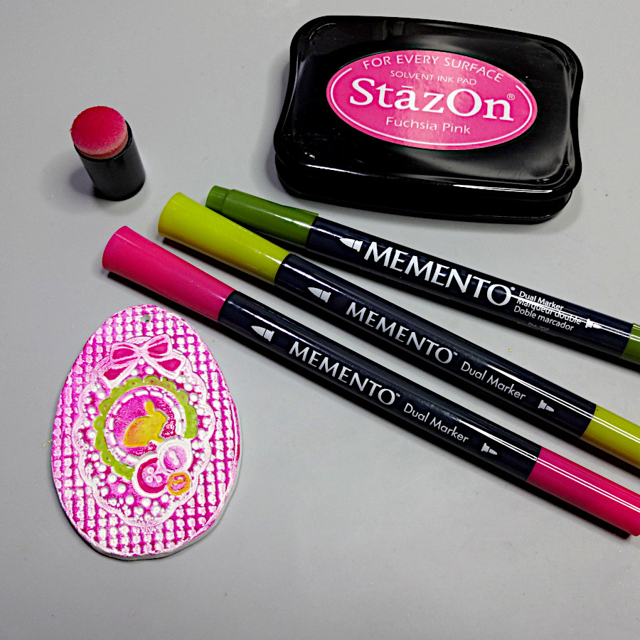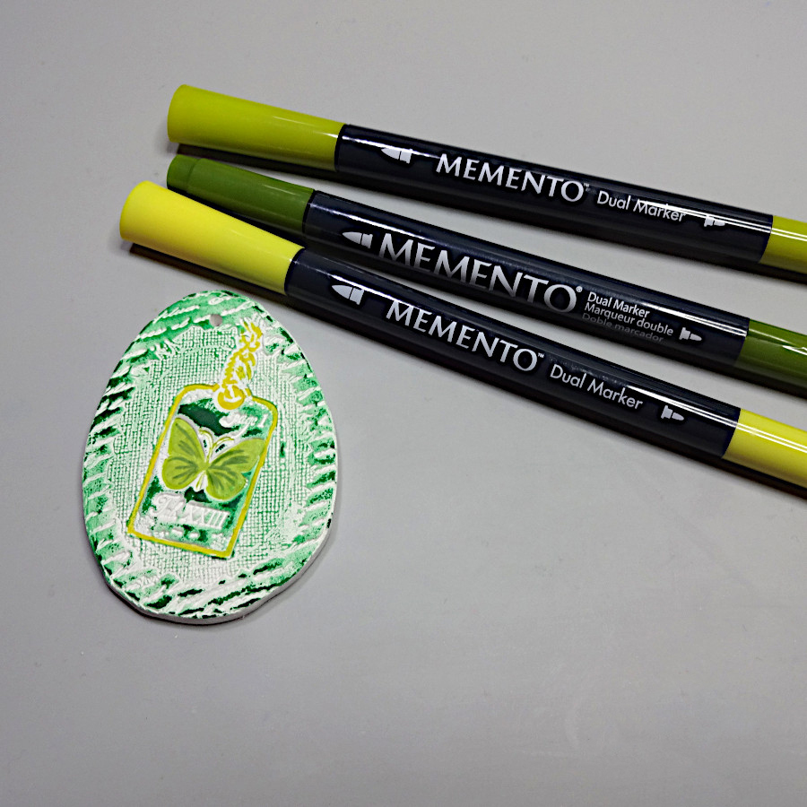 Using Memento Inks in Pear Tart, Dandelion, Tangelo, and Morocco, apply using a blending brush. The colors should fade into each other and cover the entire leaf. The photo above shows the leaf not completely inked.