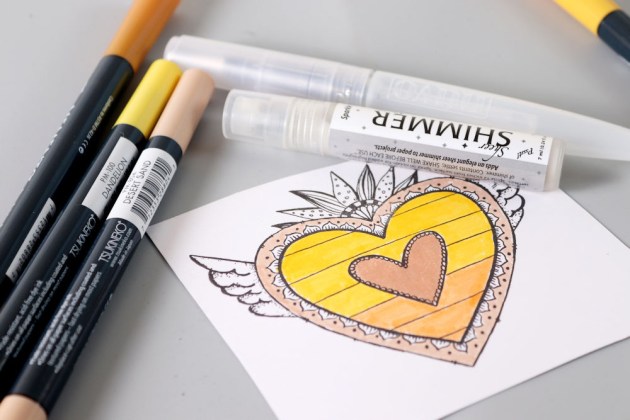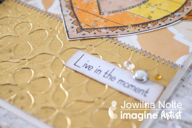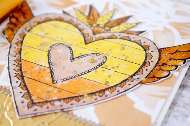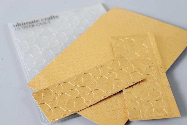 Sprinkle Sparkle Mboss embossing powder over all three images; shake off excess and return the excess to the pouch. Heat each panel to melt the embossing powder.