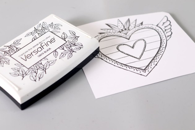 Position the smallest panel into the positioning tool again using the grid as a guide for placement. Ink the stamp with Fantasia VersaFine Clair ink and stamp the image onto the third and last panel.