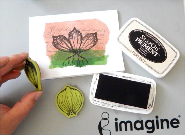 Cut 3 cardstock panels from white cardstock using the following dimensions: 4 ¾” X 6.25”, 2.5” x 4.5”, 1.5” x 3.5”. Place the largest panel in the stamp positioner and center the large flower bouquet stamp in the center of the paper. Close the lid to pick up the stamp. Ink the stamp with Morning Mist VersaFine Clair ink; press the image onto the cardstock. Remove this panel from the stamping tool, leaving the stamp in place.