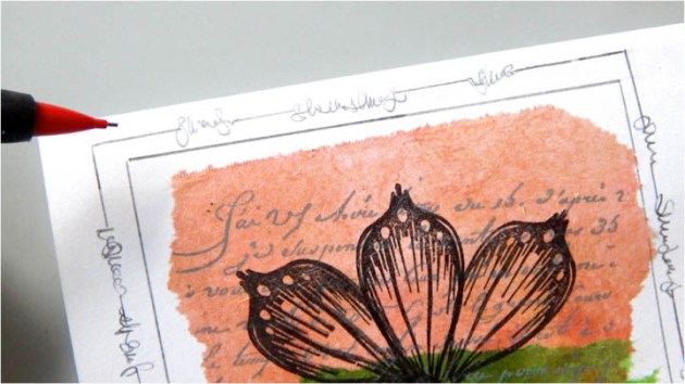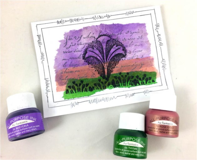 Position the smallest panel into the positioning tool again using the grid as a guide for placement. Ink the stamp with Fantasia VersaFine Clair ink and stamp the image onto the third and last panel.