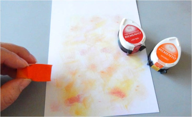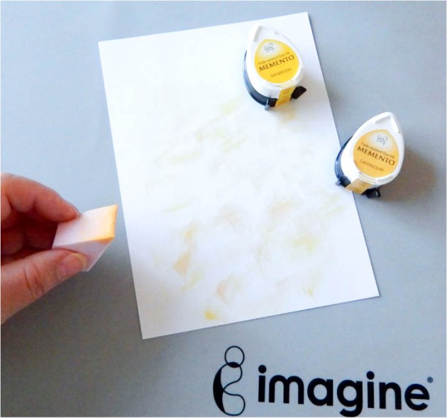 Use a sponge dauber to apply Bamboo Leaves Memento ink onto a white cardstock panel. Repeat Cottage Ivy Memento ink until the panel is covered.