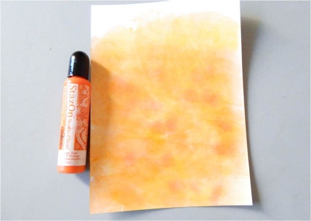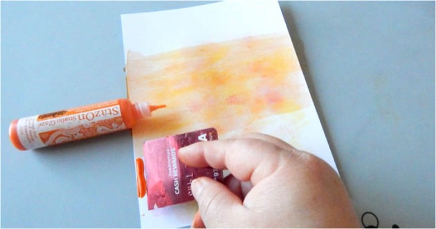 Squeeze a few drops of Moonlight White Brilliance re-inker onto a craft mat. Spray with 91% Isopropyl Alcohol. Use a paintbrush to mix the ink. Load the paintbrush with the diluted Moonlight Brilliance ink and splatter the background panel. Let air dry or heat set.