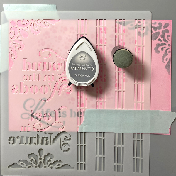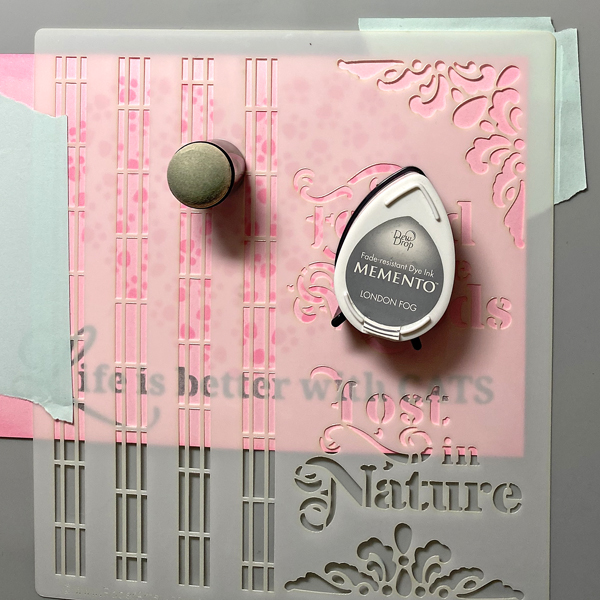 Tape the Time Tunnel Stencil over the inked background panel. Use a sponge dauber to apply Paris Dusk Memento ink over the stencil onto the paper.