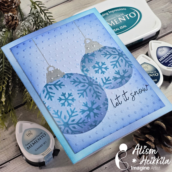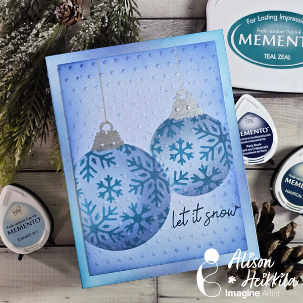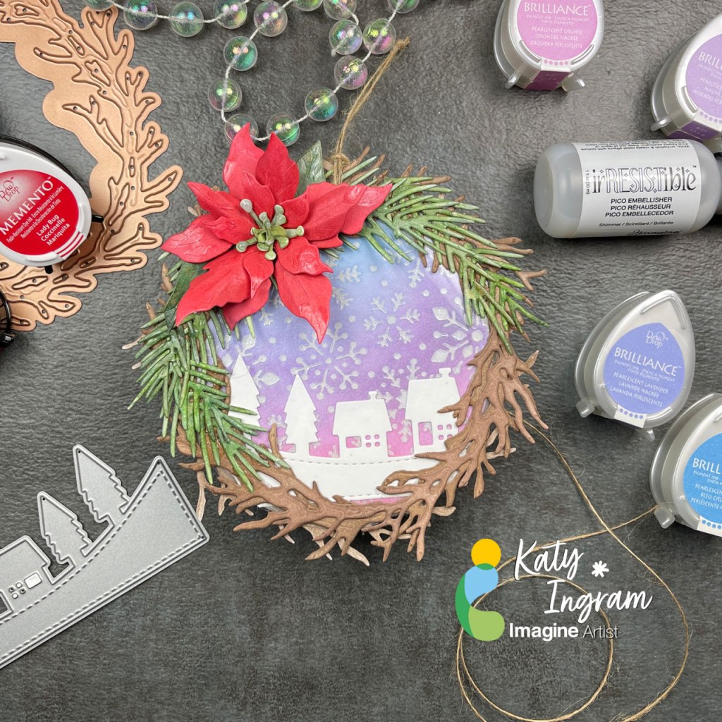 Stamp the holly leaves and berries using StazOn Opaque – Cotton White on the ornament around the sentiment using the stamping tool or small stamping blocks.