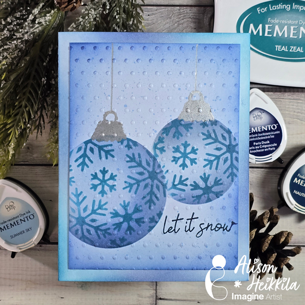 Write lightly the word “Noel” (or any word you want on your ornament) with pencil and then trace it with the Tuxedo Black Memento Marker brush tip. You can skip the pencil if you can do handlettering directly with the marker.