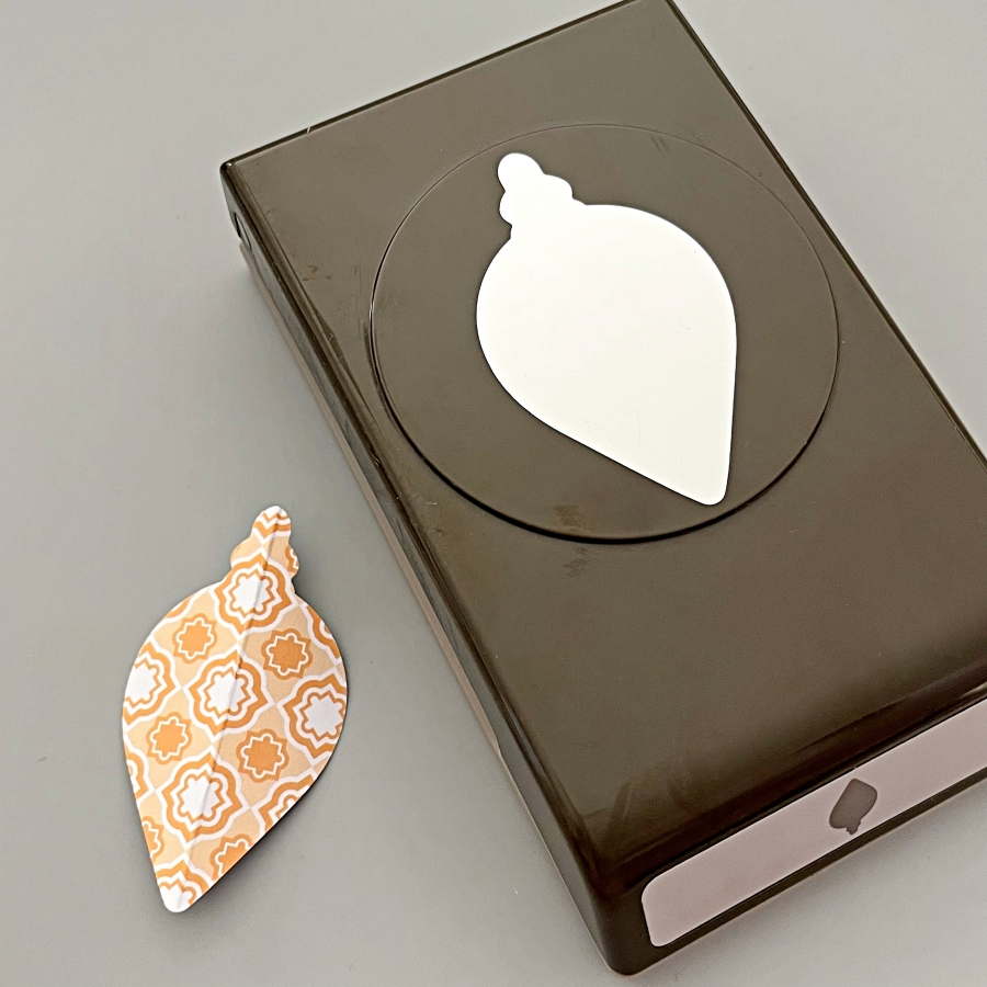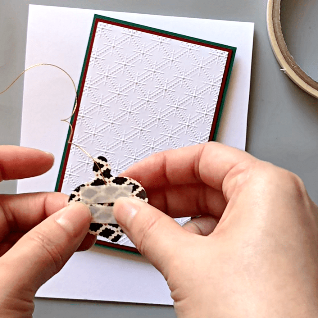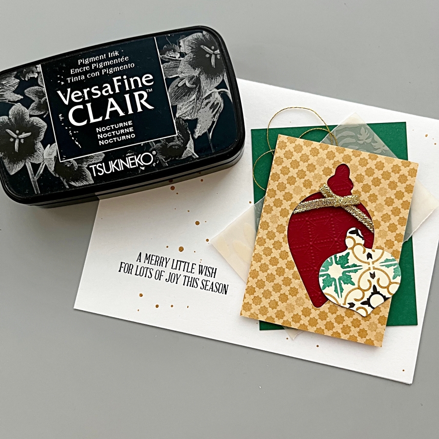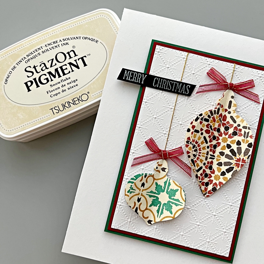 Stamp the holly leaves and berries using StazOn Opaque – Cotton White on the ornament around the sentiment using the stamping tool or small stamping blocks.