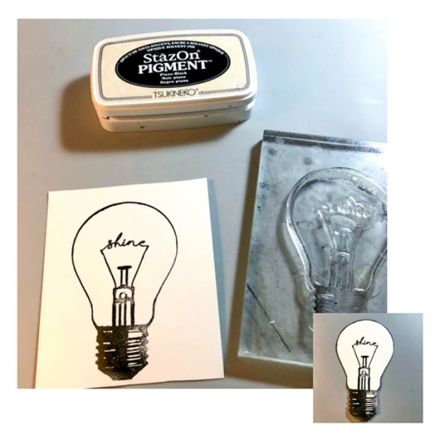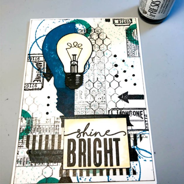 Ink up an insect you like…I went with a cicada and used Nocturne VersaFine Clair Ink. To give the bug metallic shine, I applied New Sprout and Cottage Ivy Fireworks! Spray to the body and Sheer Shimmer Spritz in Sparkle to the wings with a brush. Let dry, then cut out.