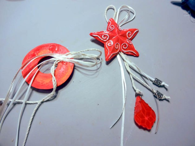 Place the star shapes, white side up, stamp with VersaMark the swirls stamp, cover with Mboss clear embossing powder and heat set.