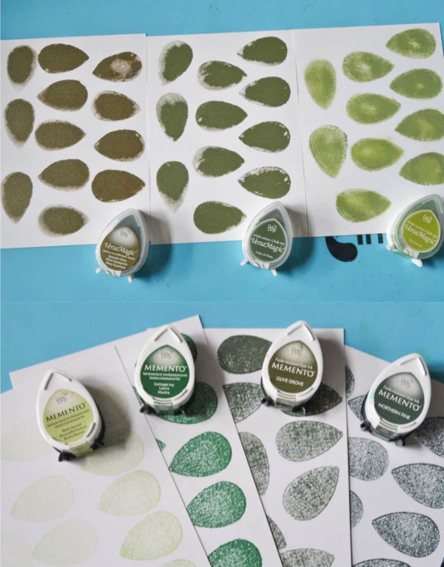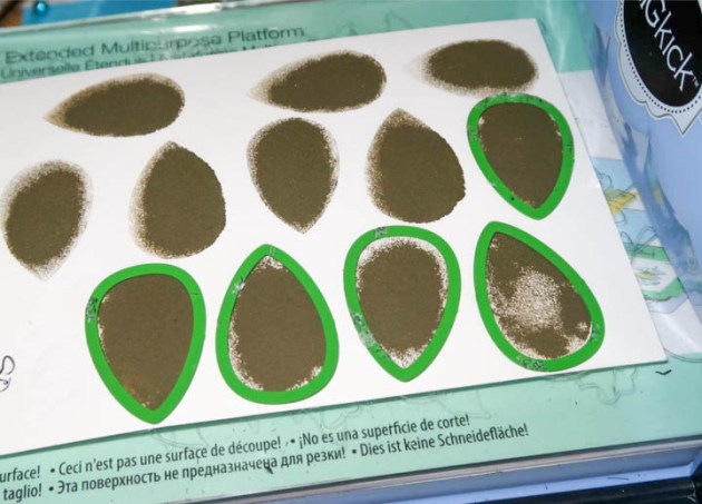 Stamp out dozens of dew drops using several colors of Memento and VersaMagic inks. In addition to these Dew Drop shapes, I also rubbed Delicata Golden Glitz and Emerald Green inks onto white cardstock.