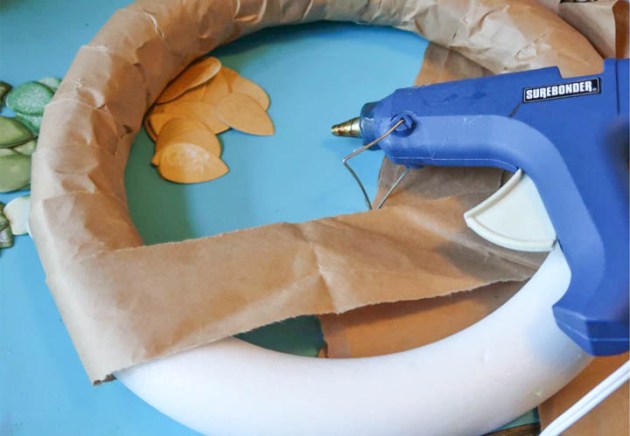 Tear strips of brown craft paper into 1.5 – 2” wide strips. Wrap these strips around a foam wreath until the whole wreath has been covered.