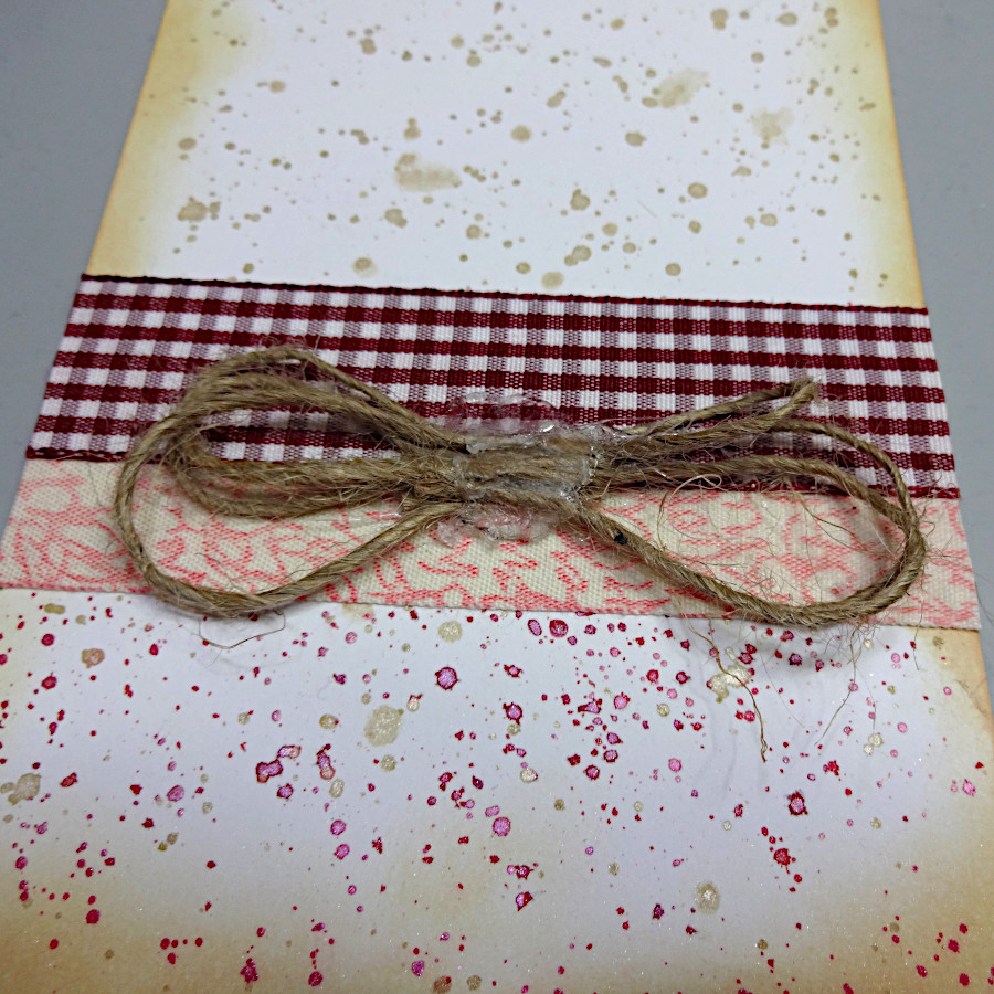 Simple and easy to make Easter greetings card with an egg shell-like background made by sprinkling Fireworks! paint on a blank white card and lightly distress with MEMENTO Desert sand ink pad. Stamp on a piece of cotton ribbon with VersaFine CLAIR Tulip red to use as an embellishment to decorate the card.