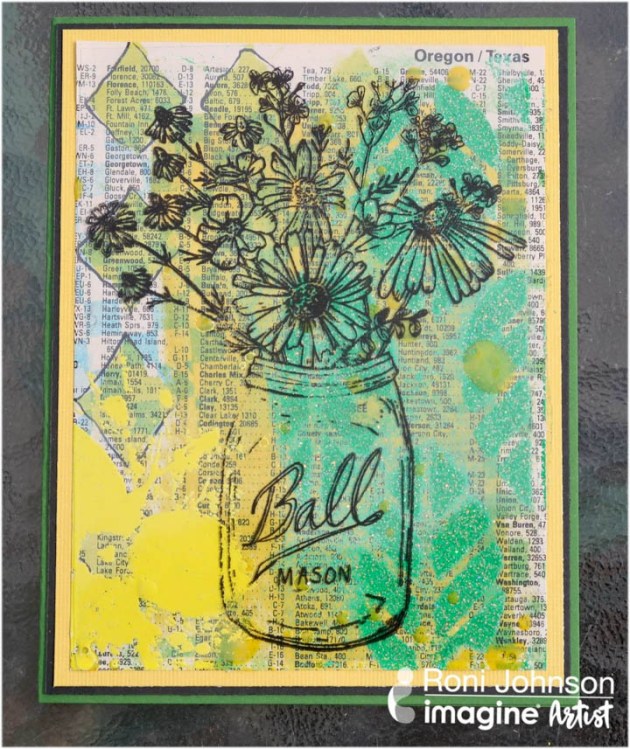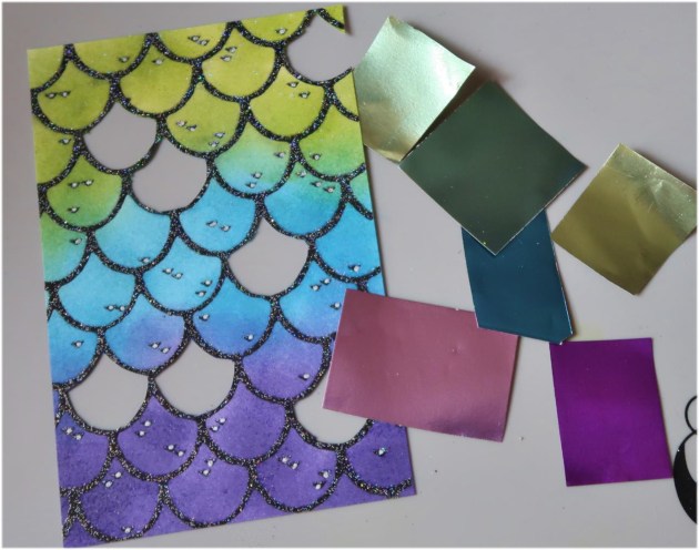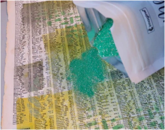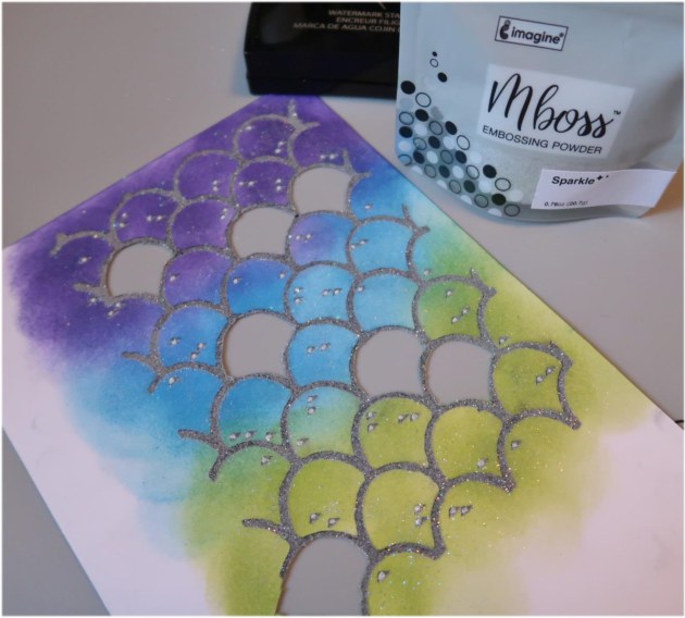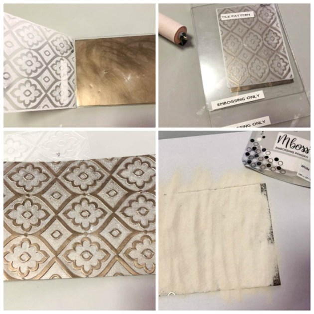Sprinkle Sparkle Mboss embossing powder over all three images; shake off excess and return the excess to the pouch. Heat each panel to melt the embossing powder.