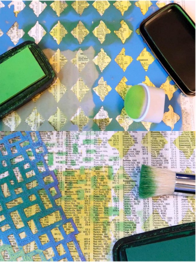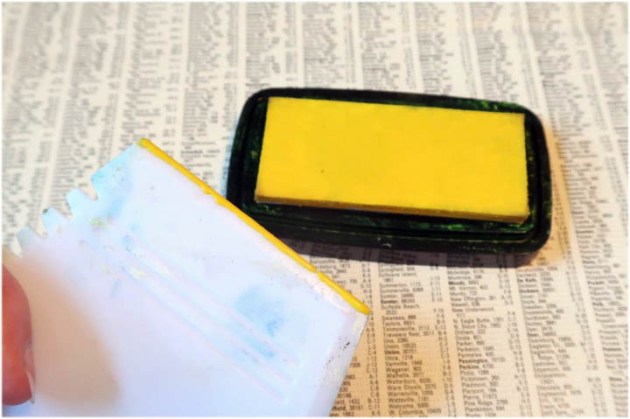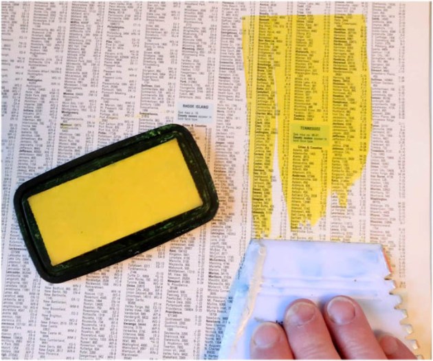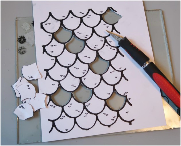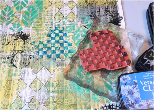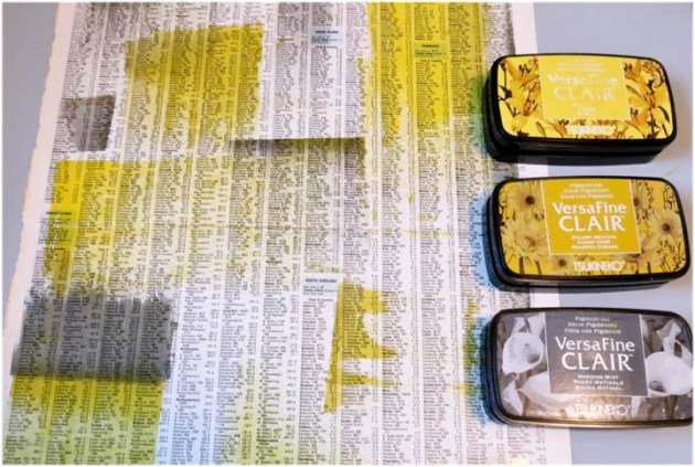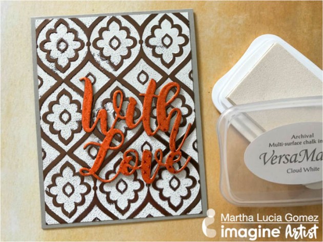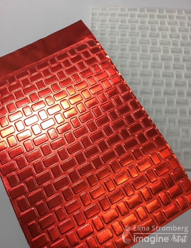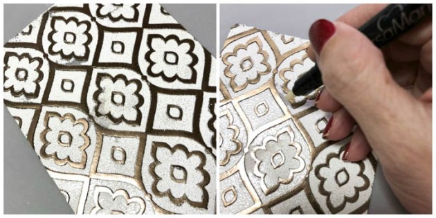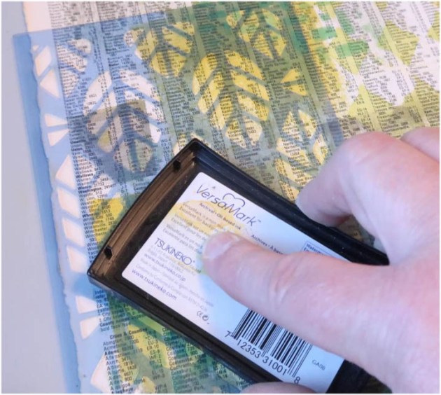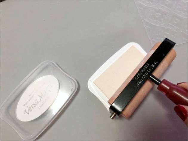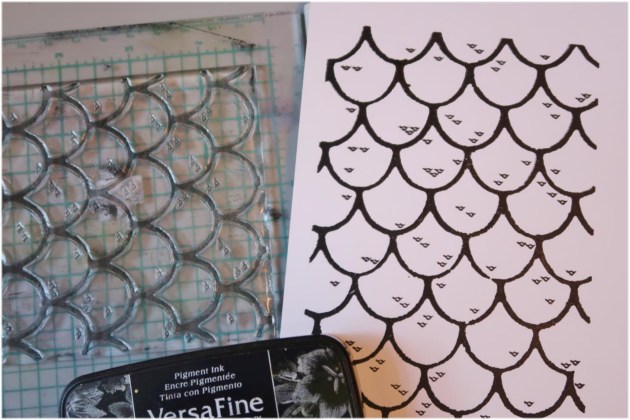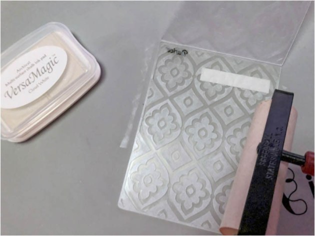 Position the smallest panel into the positioning tool again using the grid as a guide for placement. Ink the stamp with Fantasia VersaFine Clair ink and stamp the image onto the third and last panel.