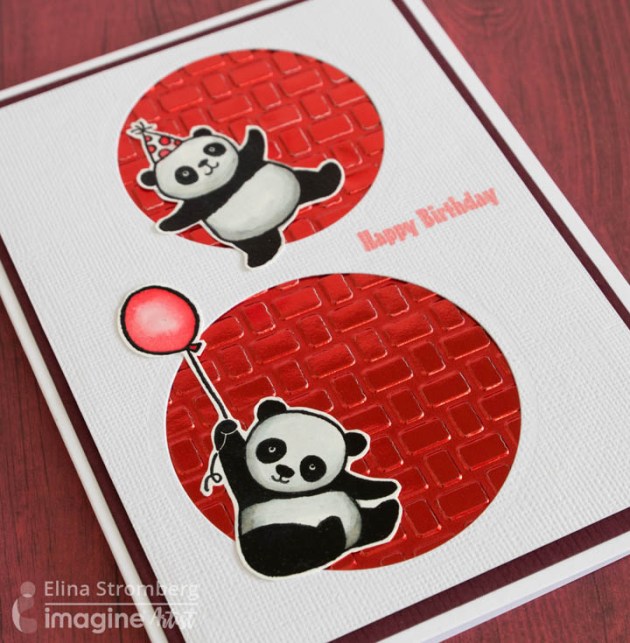 Mount the largest panel onto a black card base. Adhere the other two panels over the first panel, aligning the image properly each time. Add a few Waffle Flower Stardust Enamel Dots to the card.