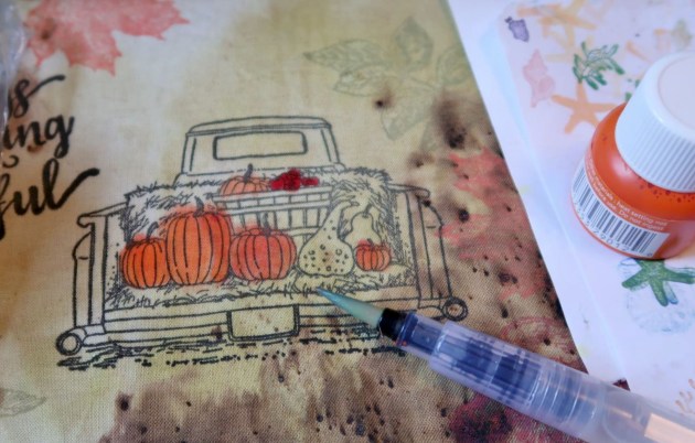 Spray water on the fabric. Place a small drop of Red Delicious All-Purpose ink.