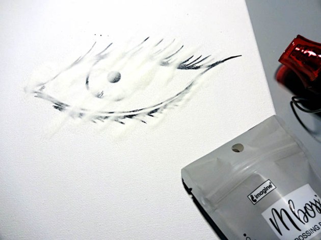Cut a piece of paper at the shape of eye, place it on top and sprinkle or flick All-Purpose Ink Real black on the canvas.