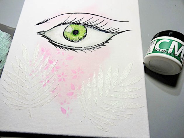 Use the flower stencil and sponge daubers with the VersaColor Orchid and Memento Angel Pink ink pads to decorate under and top of the eye on the canvas.