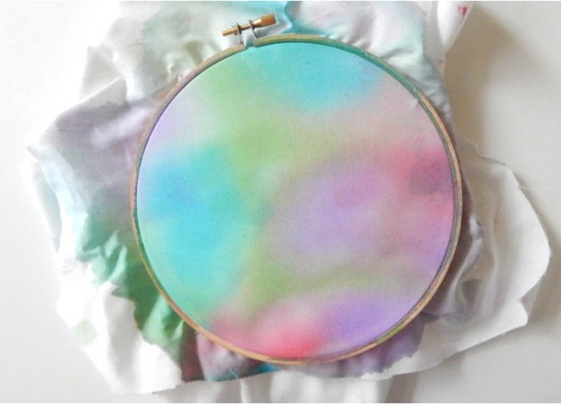 No matter the stitch you use, you must make a knot in the back when you are finished with a segment. Add different stitch types for added variation. Once you are finished. Cut the excess fabric. Glue the excess fabric onto the hoop.