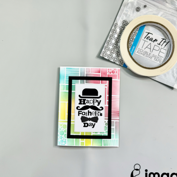 Add the sentiment panel at the center of the stenciled card with Tear It! Tape, and add the black frame to the card with the same adhesive.