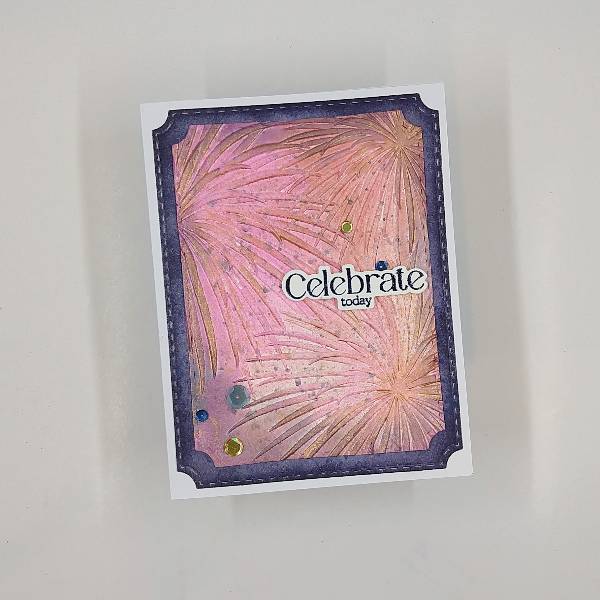 Use one of two small stamps to add some texture and color to each of the ornaments: Warm Breeze VersaFine Clair ink (on the Lilac Posies Fireworks! Craft Spray), Nocturne VersaFine Clair ink (on the Tangelo Fireworks! Craft Spray), Strawberry VersaFine Clair ink (on the Angel Pink Fireworks! Craft Spray), and Night Sky VersaMagic Chalk ink (on Lulu Lavender Fireworks! Craft Spray). Heat emboss each of the snowflakes with clear embossing powder.