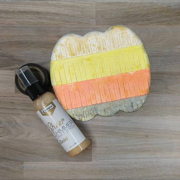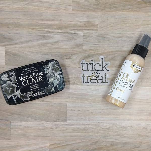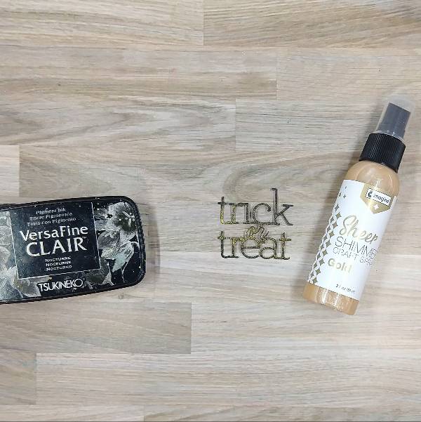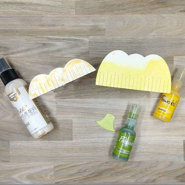 Then press the Golden Glitz Delicata ink pad onto a piece of acetate packaging and spray with water. Then press the acetate packaging onto each of the ornaments to add gold shimmer.