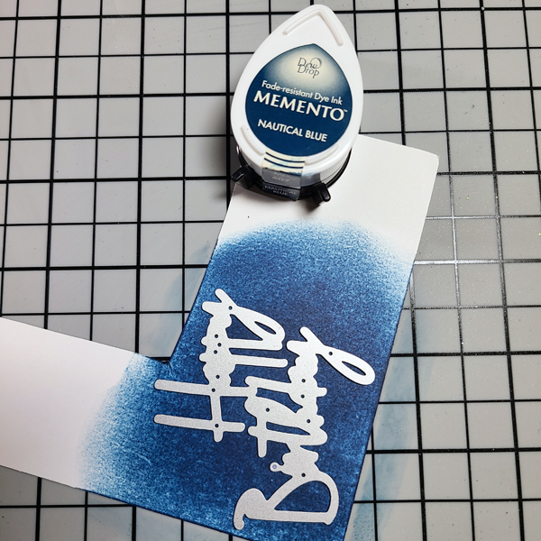 Step 12: To make perfectly coordinated cardstock for your sentiment, ink up a piece of white with Nautical Blue. Die cut the sentiment. Cut the shadow layer from vellum.