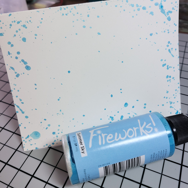 Step 13: Shake up the Summer Sky Fireworks Spray, unscrew the bottle and flick the straw on your card base to create splatters. Let dry.