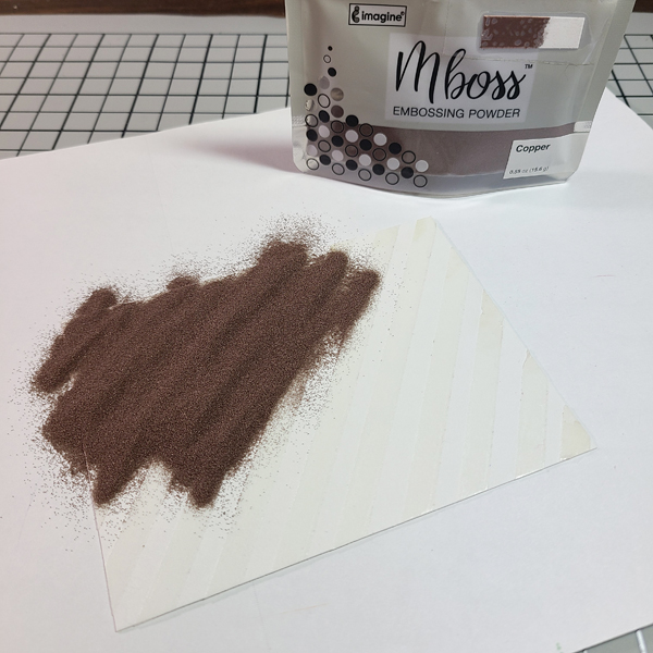 Step 6: Pour Copper MBoss embossing powder on to the panel. I put a piece of copy paper underneath so that I can pour the excess back into the bag. I recommend rubbing your finger across the panel to ensure good coverage of the powder.