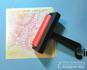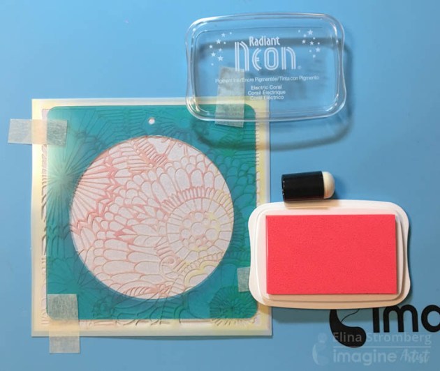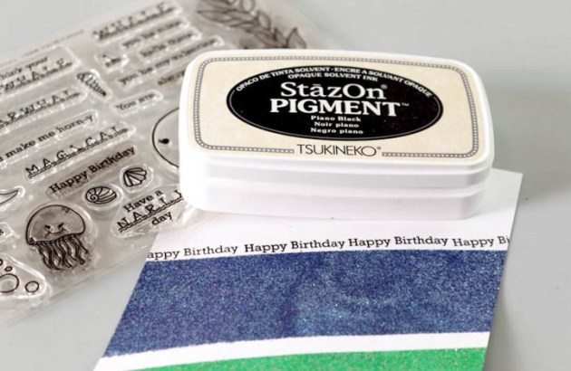 Combine VersaFine Clair and Memento Luxe inks in the same color to stamp layers. For my first color I combined the yellow inks – first stamping Golden Meadow VersaFine Clair and then on top I stamped Dandelion Memento Luxe.