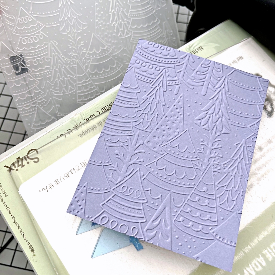 Then I stamped a different pine tree image on the left and right at various heights. You might notice that some of the pine trees appear darker; that is because I stamped the image twice. By using a stamp positioning tool, you can restamp an image at the same spot. In this case, it creates a darker shade of color even though you are using the same color ink pad. On the very left, there is a pine tree that looks lighter in color. To achieve this effect, you can stamp lightly on a piece of scrap paper first. Then, using the leftover ink, stamp on the cardstock to create a lighter shade.