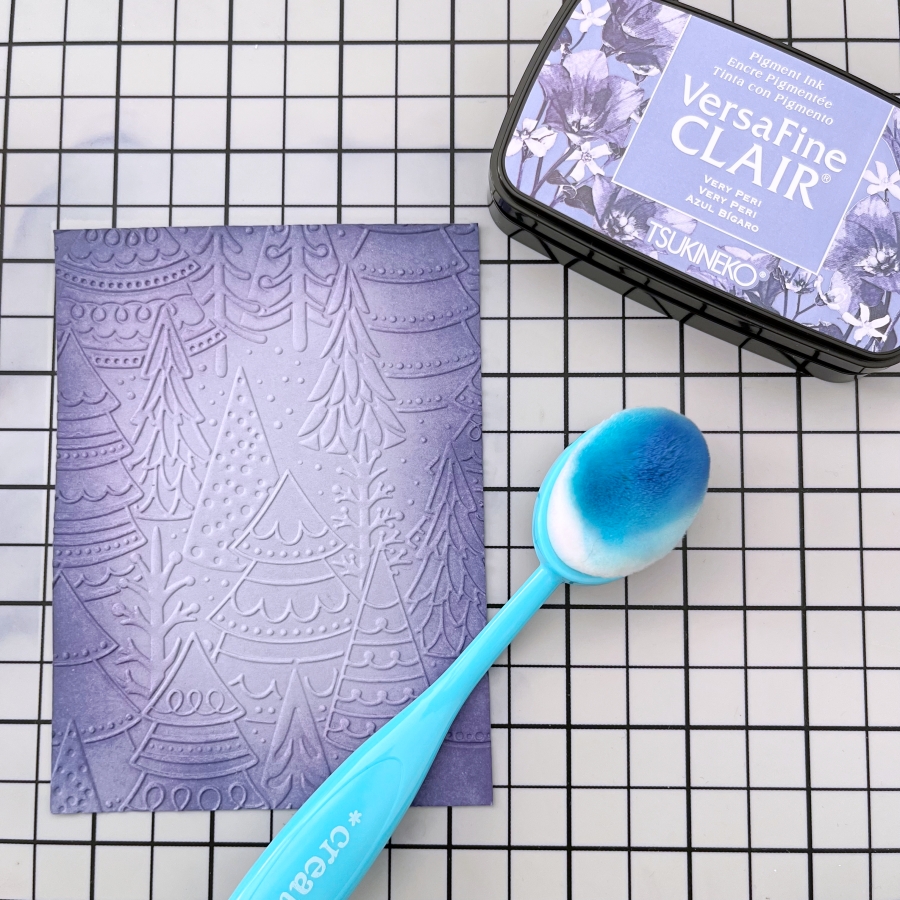 The ink pad I will be using today is VersaFine Clair Spruce. It is perfect for stamping the pine tree images from Stampin’ Up’s Winter Woods set. I stamped the image in the center on a piece of 3 ½’’ x 4 ¾’’ Soft Seafoam cardstock.