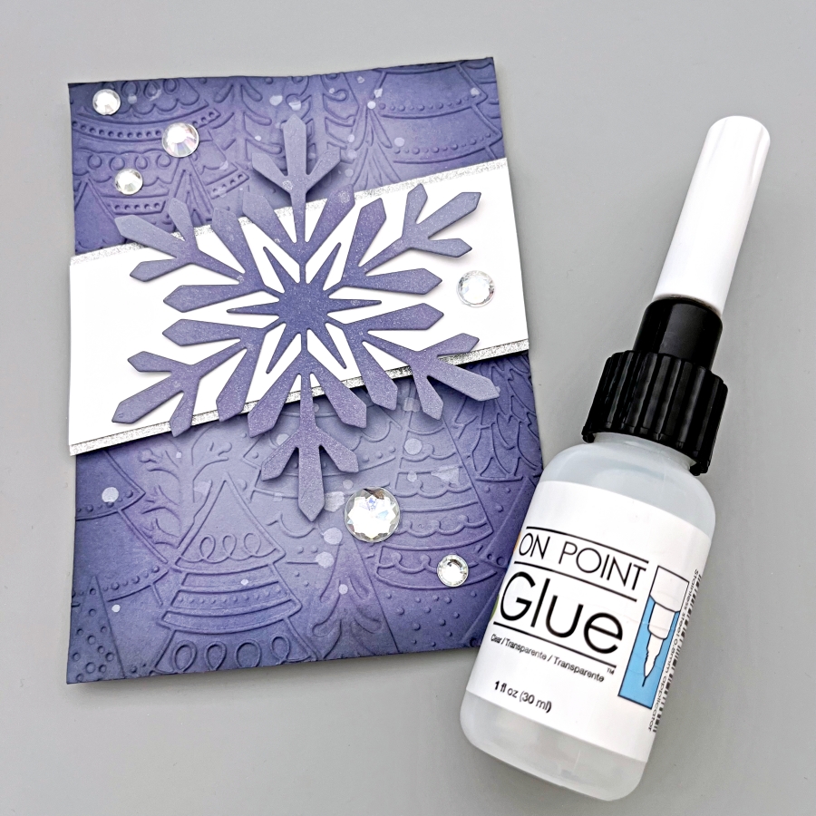 Then I adhered the stamped panel to a piece of Shaded Spruce cardstock that measures 3 ¾’’ x 5’’. After that, mount the cardfront to an A2 Mint Macaron cardbase. For some finishing touches, I adhered some white and gold sequins with On-Point Glue, and this holiday card is complete!