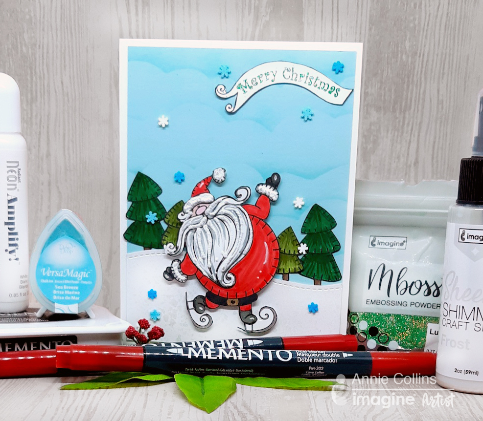 December Color of the Month is Frosted Blue! We love the bright icy blue color in Christmas decor, Christmas ornaments, and wintery snowflake themed art. Tsukineko and Imagine feature several products in their catalog that are perfect for this color theme. Memento Dye inkpad in Summer Sky, Fireworks Shimmery Craft Spray in Summer Sky, VersaMagic in Seabreeze and any of these inks can be spritzed with Sheer Shimmer Spray in Frost!