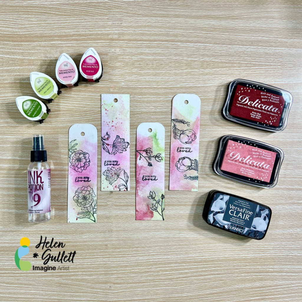 Next step is to create the watercolor wash background using Memento DewDrop ink and Ink Potion No. 9 Spray on each of the bookmarks.