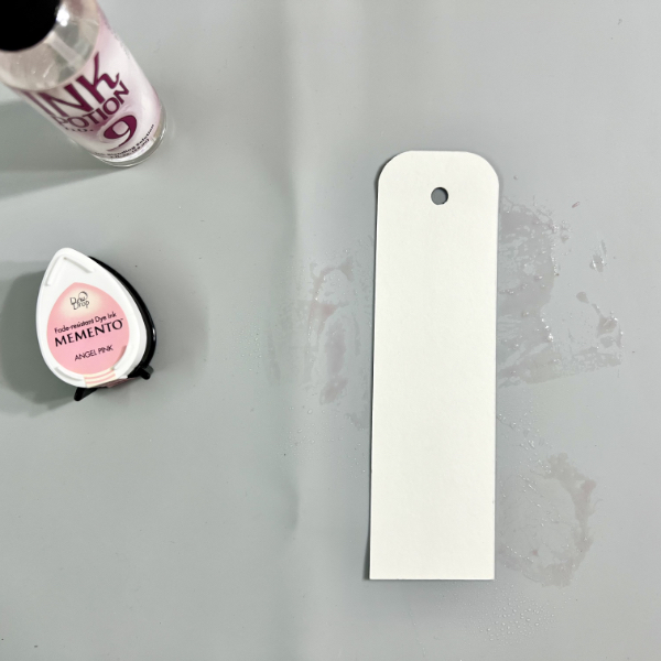 Dab some of the Delicata ink on the craft mat, spray it with the Ink Potion No. 9, and then smoosh the bookmark into the ink. Gently press it to get the ink transferred well.