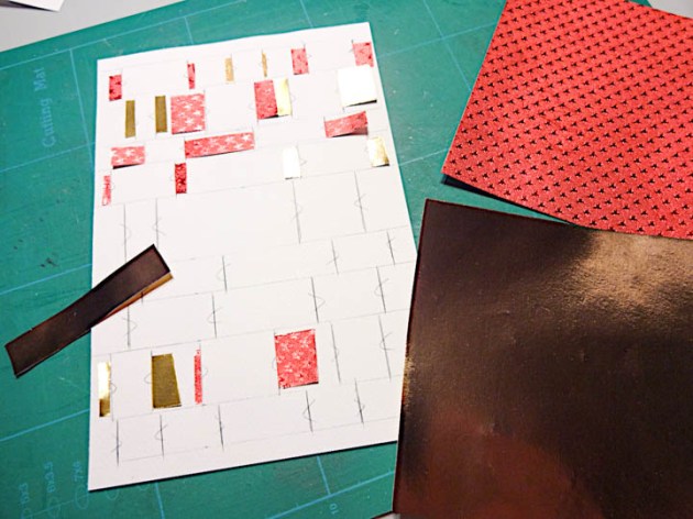 Cut stripes of the Rinea double-sided foil paper, Ruby starstruck and Mocka glossy, and pass them through the previously made openings.