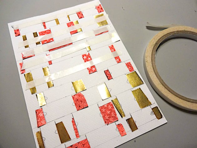 On a 4 ½ x 6 ½ inch piece of watercolor paper, mark horizontal lines in various heights. Continue with vertical one that always comes in pairs, marking one entry and one exit point where the Rinea paper stripes will go through.