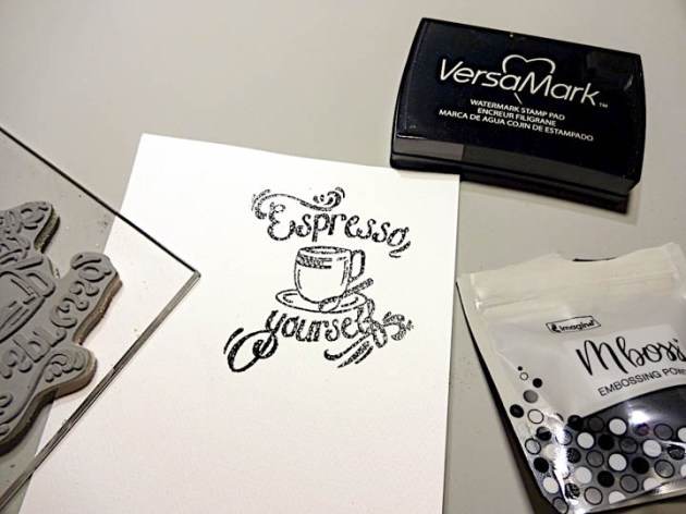 Stamp the “Espresso Yourself” stamp or alternative coffee-theme stamp with VersaMark, cover with Mboss Embossing Powder in Black and heat set.