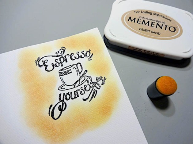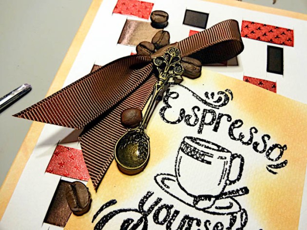Distress around the stamped image with Memento Desert Sand color and a sponge dauber. Add the ribbon, the spoon, and the coffee beans.