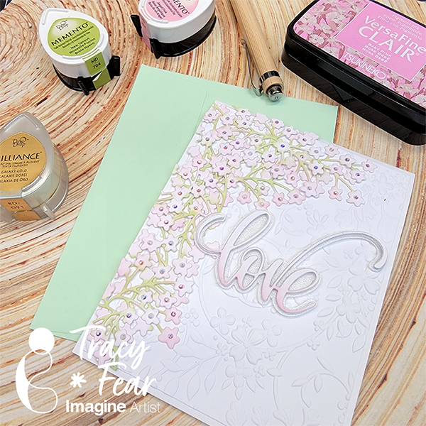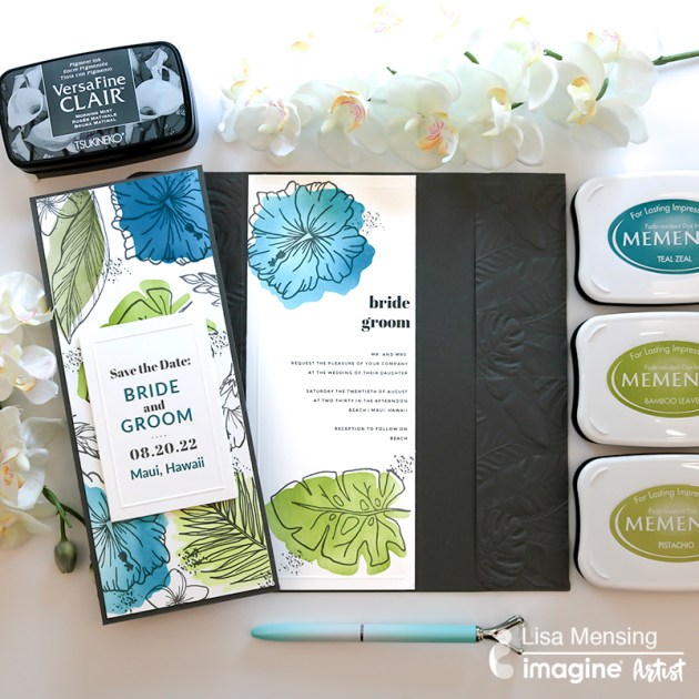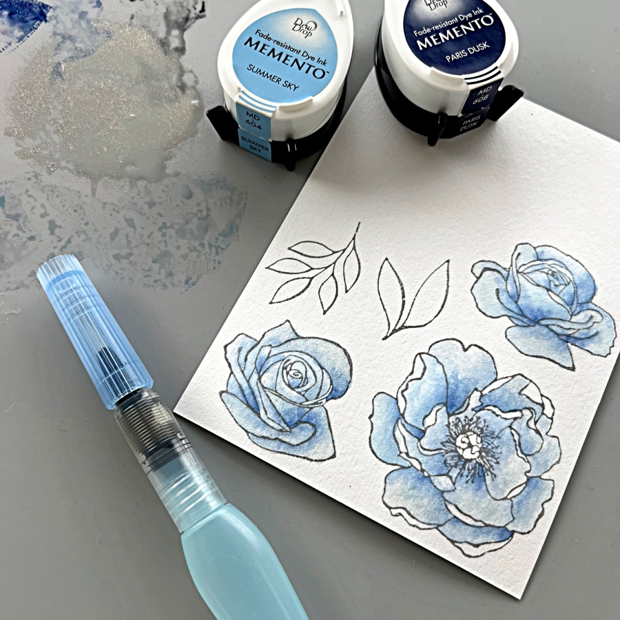 Then I stamped the floral images from Stampin’ Up’s Happiness Abounds set using the same gray ink. I mixed Memento Summer Sky ink with Sheer Shimmer Spray to color the base layer of the flowers, and added shadows with Paris Dusk. This color combination is so lovely and the perfect dusky blue for a wedding palette. The Imagine Craft Mat is also a great tool for mixing colors. Since the Memento inks are water-based, I can apply the ink directly onto the craft mat and clean the surface with a quick water rinse at the end.