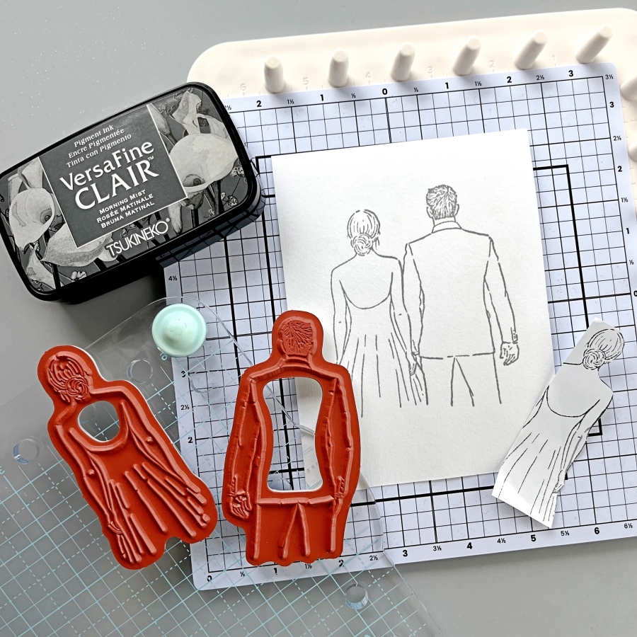 The focal point of today’s card is the bride and groom images from Stampin’ Up’s Here’s to Love set. I stamped the images on watercolor cardstock with VersaFine Clair Morning Mist ink. Most of the time the VersaFine Clair Nocturne ink is my go-to for stamping image outlines. However, I wanted to create a softer look today, and I thought this dark gray color is a great alternative to the usual crisp, black ink. I also did a little bit of masking on the bride’s right arm, so that the groom’s suit outline does not overlay on top.
