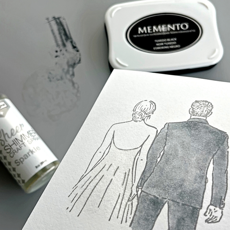 Now it is time to add some color. I wanted to try watercoloring with the Sheer Shimmer Spray to add some additional sparkle, since the card layout is quite simple. There are several metallic options to choose from for the Sheer Shimmer Sprays. I chose the color Sparkle, which is clear with a golden shimmer. I painted the bride’s dress with 2-3 coats, letting each coat dry before applying the next layer. For the groom’s suit, I mixed the spray with Memento Tuxedo Black ink. (What a coincidence with the ink’s name, ha!)